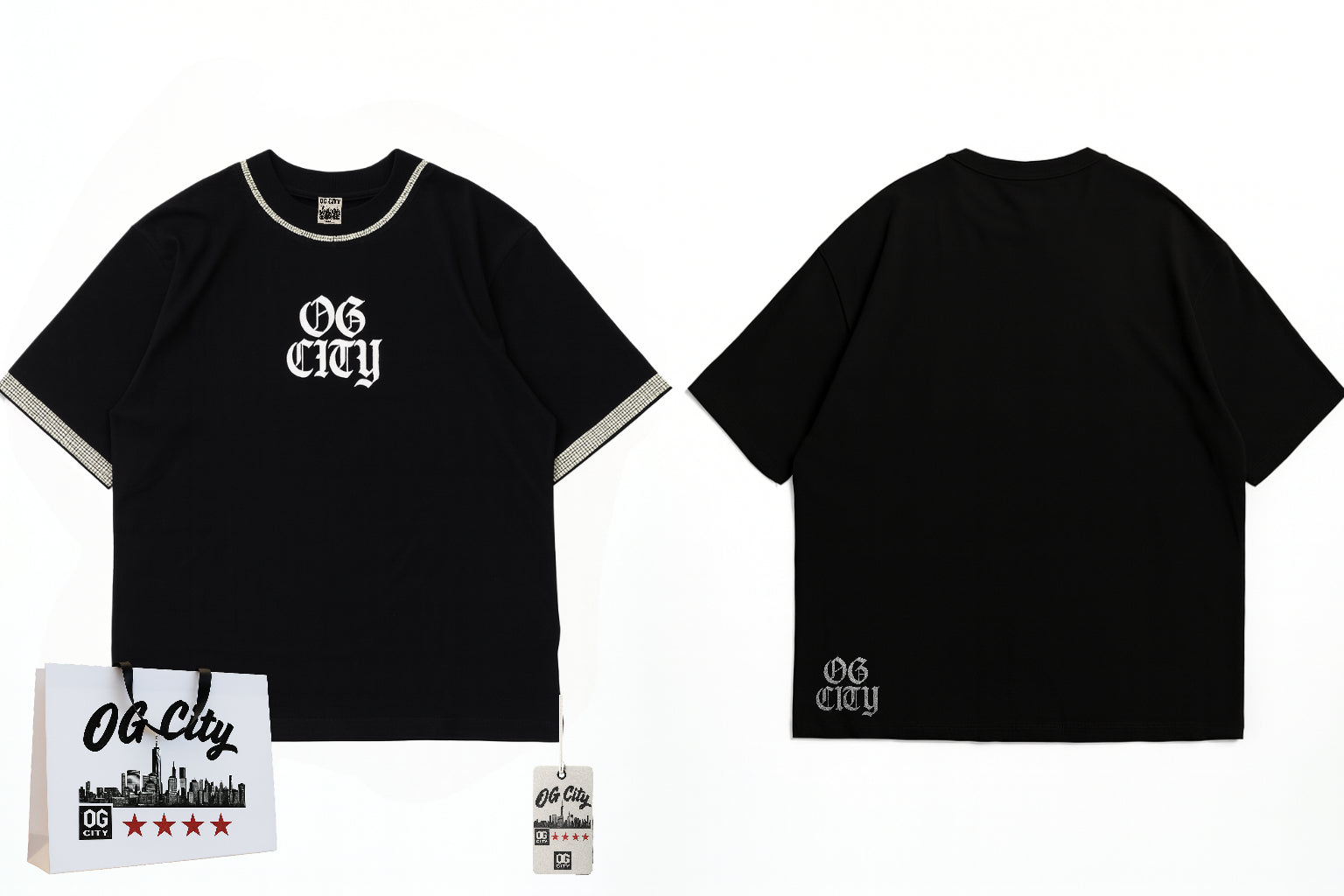 Street luxury redefined. The Diamond Gothic Tee fuses bold streetwear with premium detail , oversized fit, gothic logo, and sparkling diamond accents on the neck and sleeves.