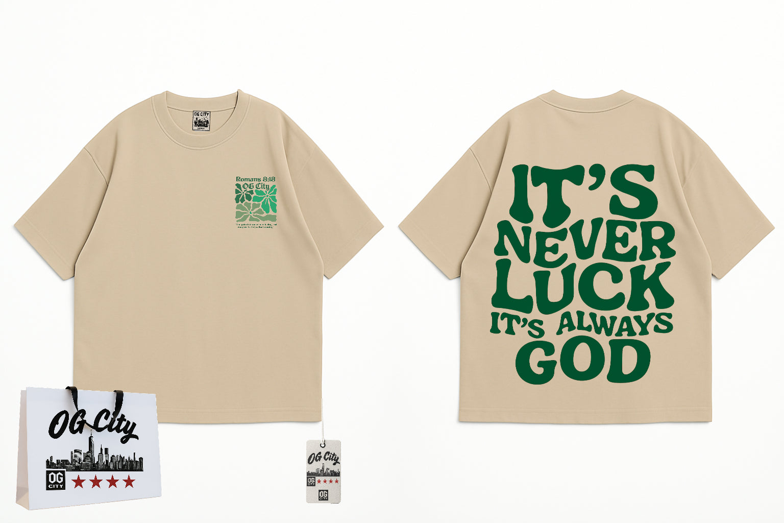 Beige oversized tee with front OG City graphic inspired by Romans 8:18 and bold back text: “It’s Never Luck, It’s Always God.” A statement piece of faith and style.