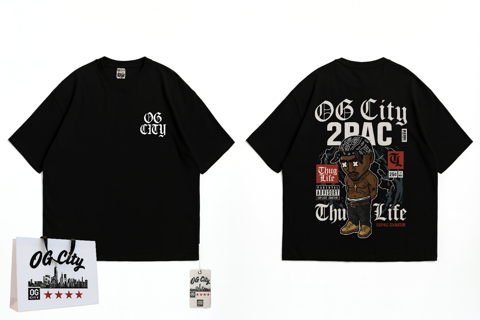 Oversized black tee featuring the OG City gothic logo on the front and exclusive 2PAC “Thug Life” artwork on the back. A streetwear essential for hip-hop lovers.