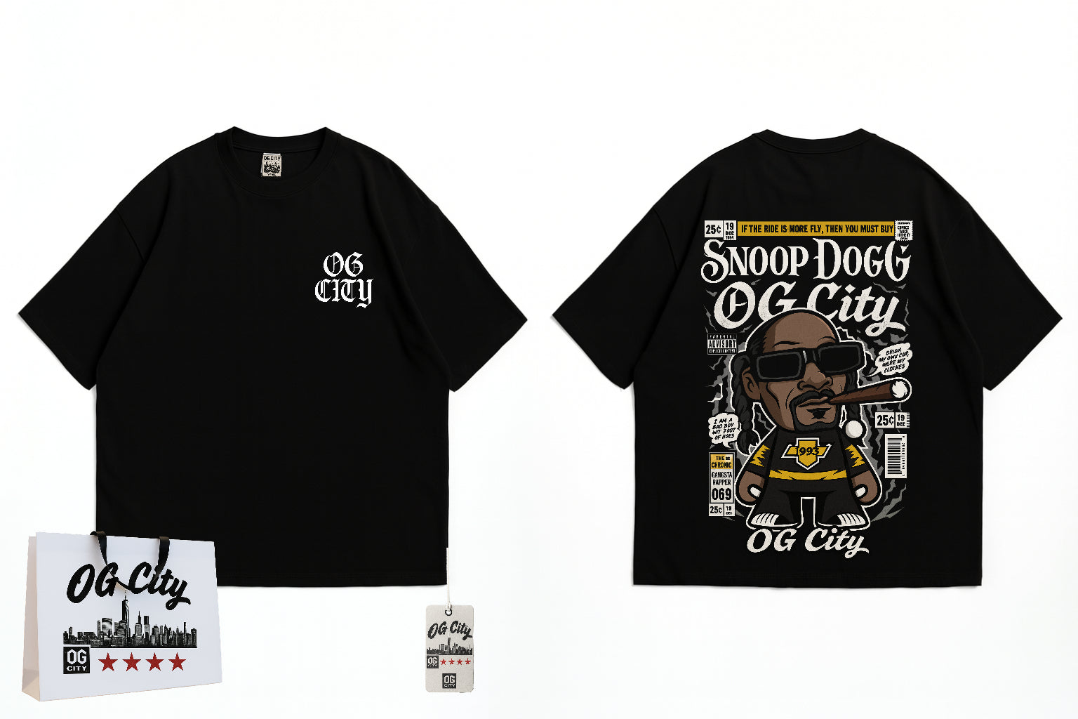 Oversized black tee with OG City gothic logo on the front and exclusive Snoop Dogg cartoon artwork on the back. A must-have streetwear piece for hip-hop lovers.